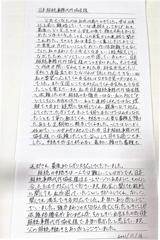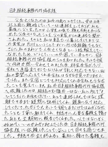 父が亡くなったのは私が24歳の時でした。母は10年以上前に離婚していて一切連絡を取っておらず、私も最後に父と会ったのは小学生の頃で、顔も名前も知らなかった父が亡くなったことを、父の実家からの連絡で聞かされました。そのとき私は東京で一人暮らしをしており、父の実家は九州ということですぐに行ける距離でもなく、さらに私のまわりで人が亡くなるという経験をしていなかったため、どうしていいのか困っているときに、日本相続事務代行協会様のことを知りました。ネットで調べ何件か問い合わせてみましたが、料金が高かったり、会社へ直接来てからでなければ詳しく対応できない、など私の要望に応えてくれる会社はなかなか見つかりませんでした。また全国どこでも対応してくれる会社も少なかったことを覚えています。私が日本相続事務代行協会様へ依頼したのは、相続の知識が一切ない私に対して「すべてこちらにお任せください、あとで連絡します。」ではなく理解できるまで疑問に説明してくれ、親身になって対応してくださったからです。ネットで調べるだけでは分からなかったことも丁寧に教えてくれ、手続きに必要な書類を預けたあとも定期的に報告してくれました。一人では何から始めていいのかわかりませんでしたが、日本相続事務代行協会様に依頼したことで、安心して日々を過ごせました。手続きが全て終わると、最初に預けた書類も返却され、最後までしっかり対応してくださいました。