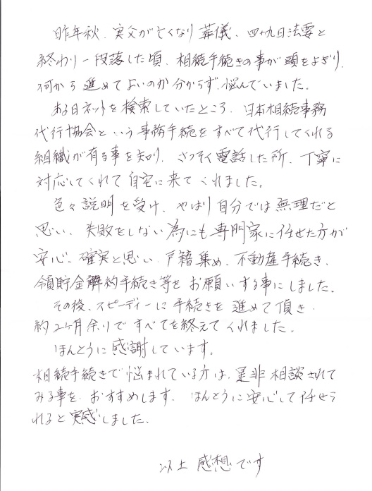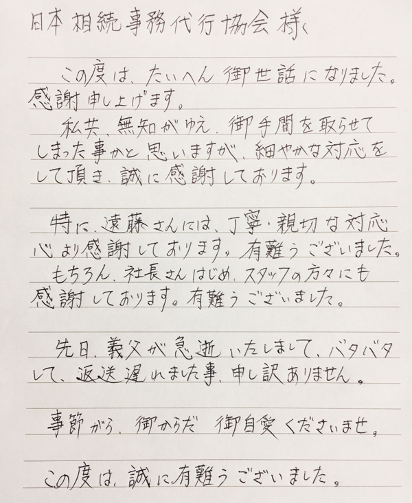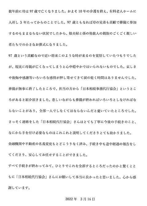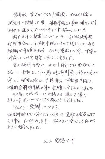すべて手続きが終わってみて、ひとりでこれを全部するところだったのかと驚くとともに「日本相続代行協会」さんにお願いして本当に良かったと思いました。心から感謝しています。