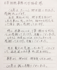相続の手続きは一人では難しいことばかりです。日本相続事務代行協会様はホームページにあるように、その人に合った方法で対応してくださいます。税金に関しても裁判に関しても私が困っていたことにサポートしてくれ、なにに関しても満足できる対応でした。本当にありがとうございました。誰かまわりの大切な人が亡くなったときにしか依頼する機会がありませんが、そのときに出会えたのが日本相続事務代行協会様で本当に良かったと思えています。父の相続手続きをありがとうございました。