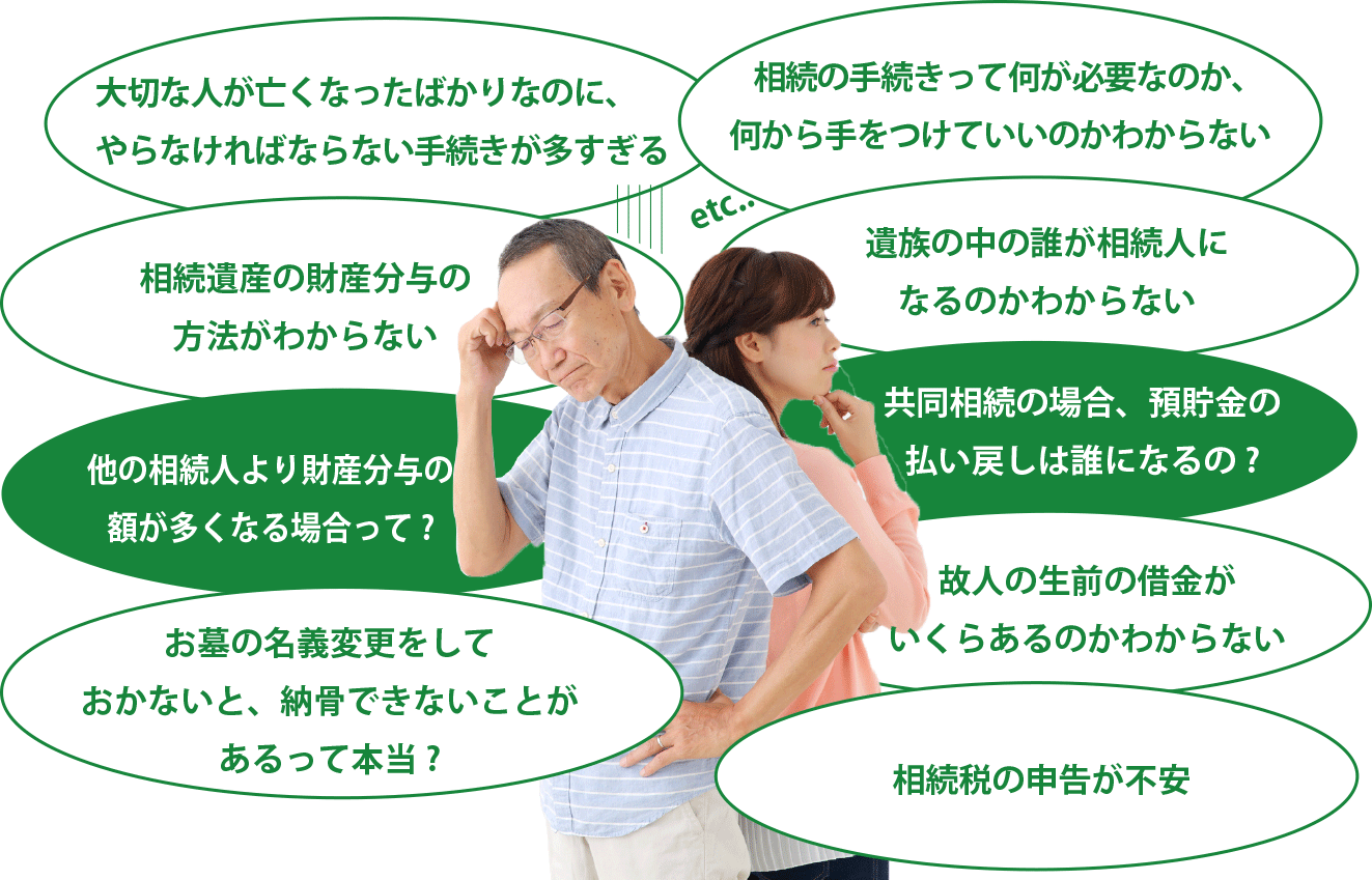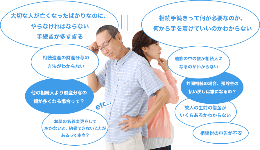 大切な人を亡くされた失意の最中、煩雑な相続の手続きを全て自らで行おうとすれば、肉体的・精神的にも非常に辛く、負担が重くのしかかります。相続の手続きは専門用語ばかりで難しく、何をやれば良いのか、誰にお願いすれば良いのかわからないと言うご意見が多い面倒な作業です。